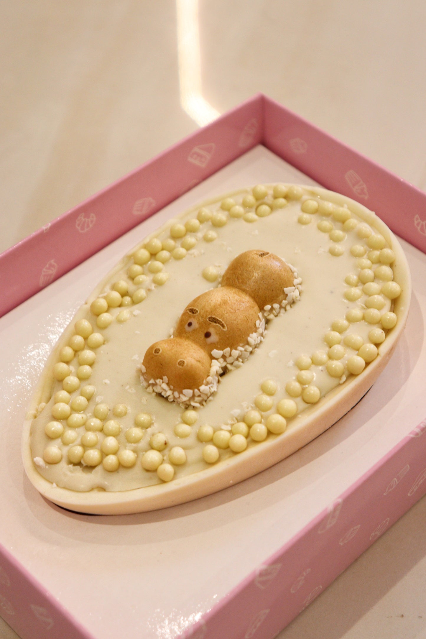 Uovo bianco ripieno artigianale con crema bueno white, crema Bueno e cioccolato bianco con scaglietta di cioccolato al latte.